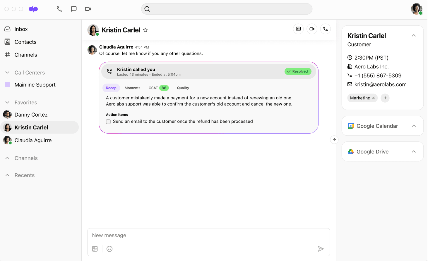 The product also provides in-call collaboration through integrated features like call transfer and internal notes, facilitating effective communication between team members. It allows agents to send follow-up emails or text messages on the same thread right after the call, adding a higher level of flexibility to a team's workflow.